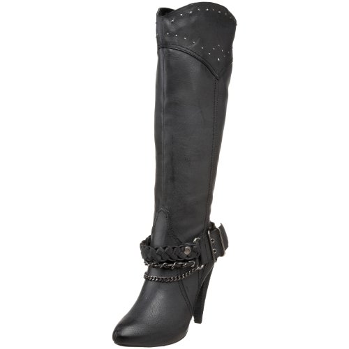 Naughty Monkey's Bets On boot offers a feminine silhouette with a little edge. This knee-high boot sits atop a tall conical heel and features dainty studs embellishing the top of the shaft, a tough braided strap and chains at the ankle, with a bold buckle and top stitching details. Tuck in jeans or leggings with ease thanks to an inside zipper, or pair this cool boot with a chic dress. Shaft height measures approximately 17" from arch. Heel measures 4". Platform measures 3/4". Boot opening measures approximately 15" around. Inside zipper measures 8". Style Name: Bets On.